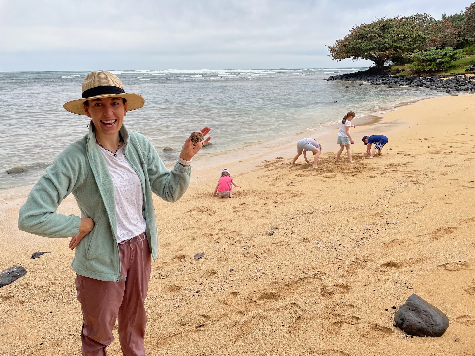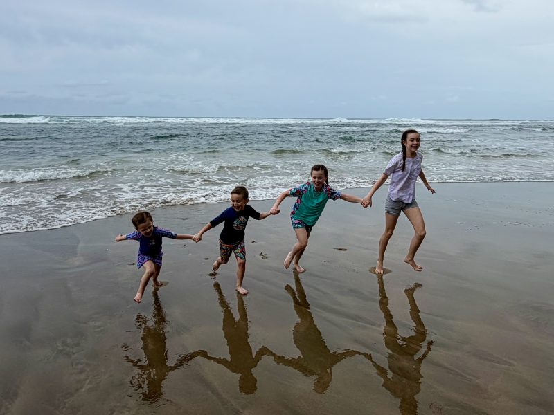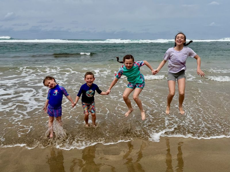 Wednesday. We took a morning walk down to Pu’u Poa beach and walked along the beach for a bit. I loved the giant trees overhanging the water. The kids instantly wanted to play in the water, even though it was a bit chilly and we weren’t in swimsuits yet. Oh well. Let them.