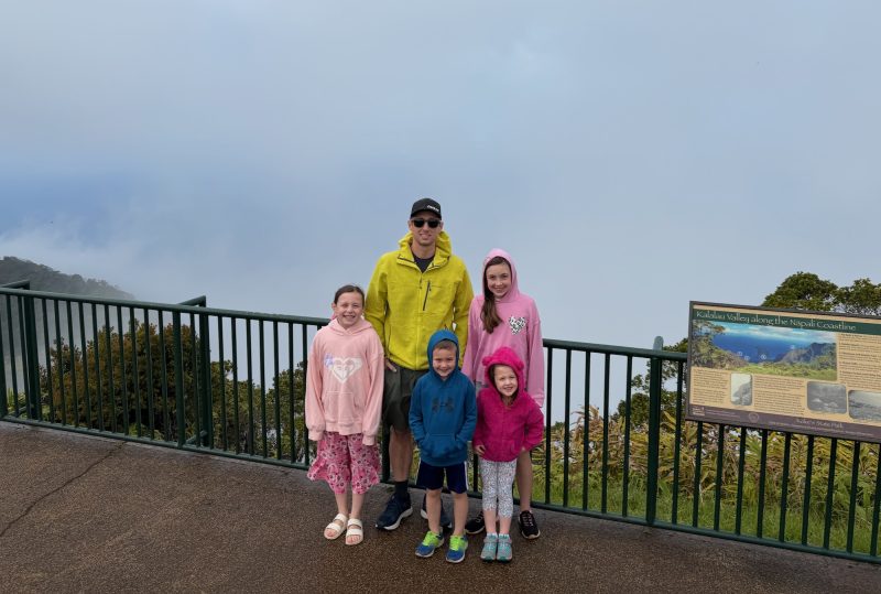 After church, we took a scenic drive around the island and up Waimea Canyon Unfortunately, it was pretty socked in and we didn’t get to see any of the canyon. At the top, we waited for a while and the clouds finally broke a little and we got out of the car for a few minutes to look around.