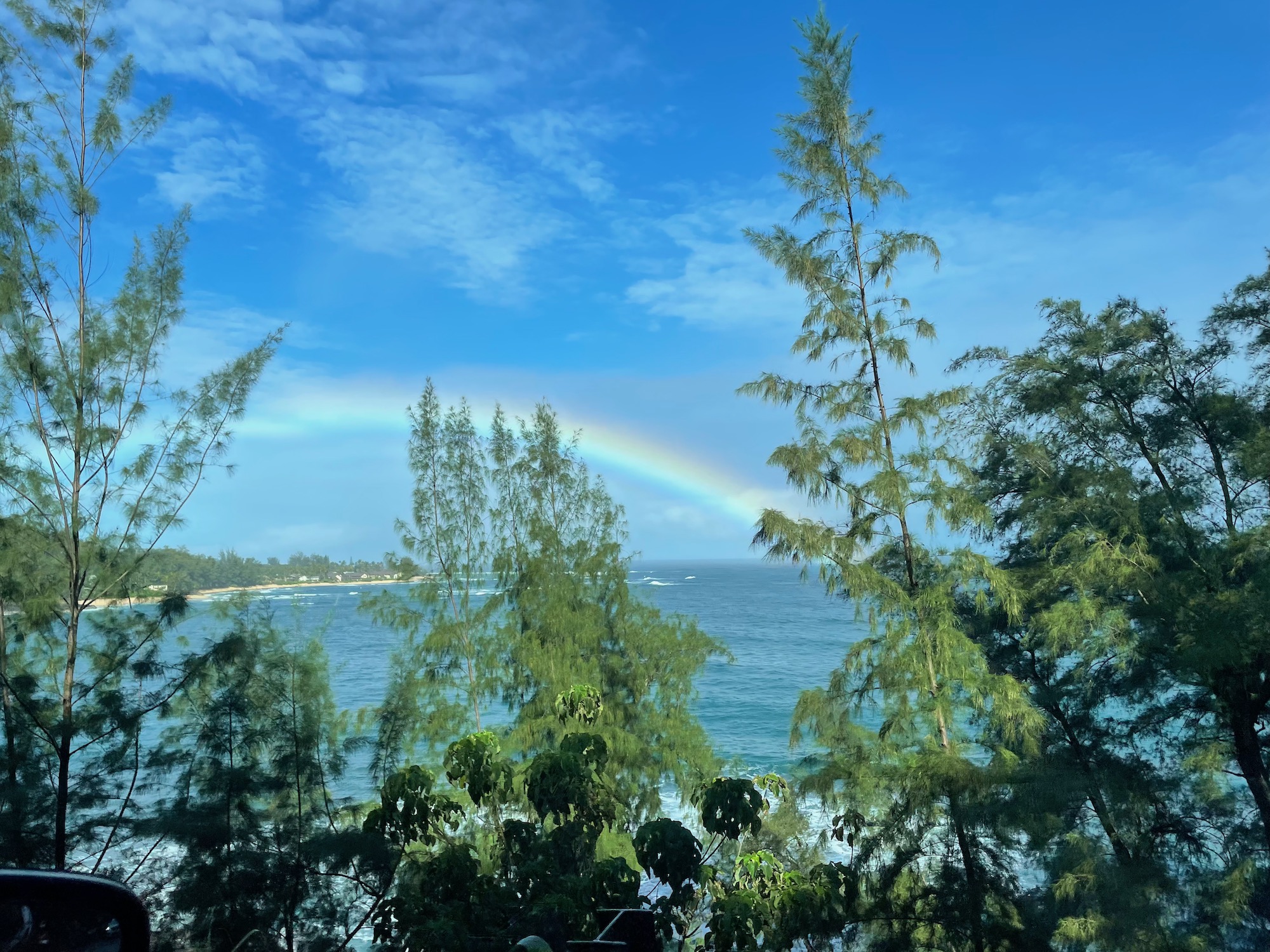 Even though it rained all night and was still drizzling at the house, and then at Hanalei, we pushed on towards Tunnels beach and found some sunshine. On the way, we were greeted with a fabulous Hawaiian rainbow.