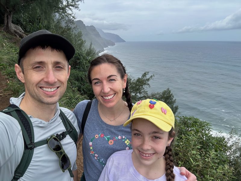 Thursday. Off to Hā’ena State Park. Kathryn, Ashley, and I headed off to hike the Kalalau Trail while Mom, Dad, Eliza, Landon, and Zoey headed over to Ke’e beach. I was really looking forward to this part of the trip, and hiking along the Nāpali Coast did not disappoint. It was beautiful, and we enjoyed a nice chat with Ashley.