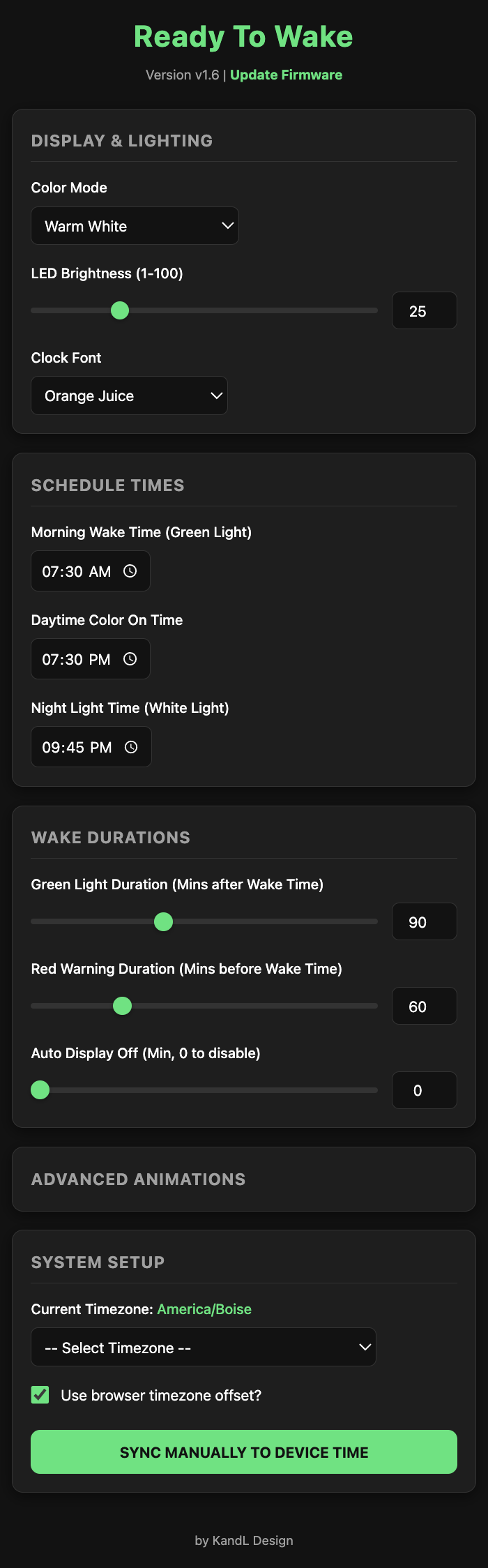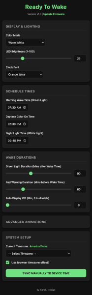 Now, go back to your browser and enter in the IP address of the clock. In my case, it’s 192.168.20.242. Alternatively, starting with v1.4, you can access it via http://readytowake.local. Once you enter that in, you will see a page that looks like this: